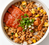 아침엔 시간이 없죠. 전자레인지에 밥 데우고 낫또 팩 바로 열어요. 소스 반찬 넣고 숟가락으로 빠르게 저어요. 시계 보면 25초 만에 완성돼요. 이걸 계란프라이나 치즈 올려서 먹으면 영양 균형 완벽. 칼로리도 350kcal 정도로 가볍고 부담 없어요.